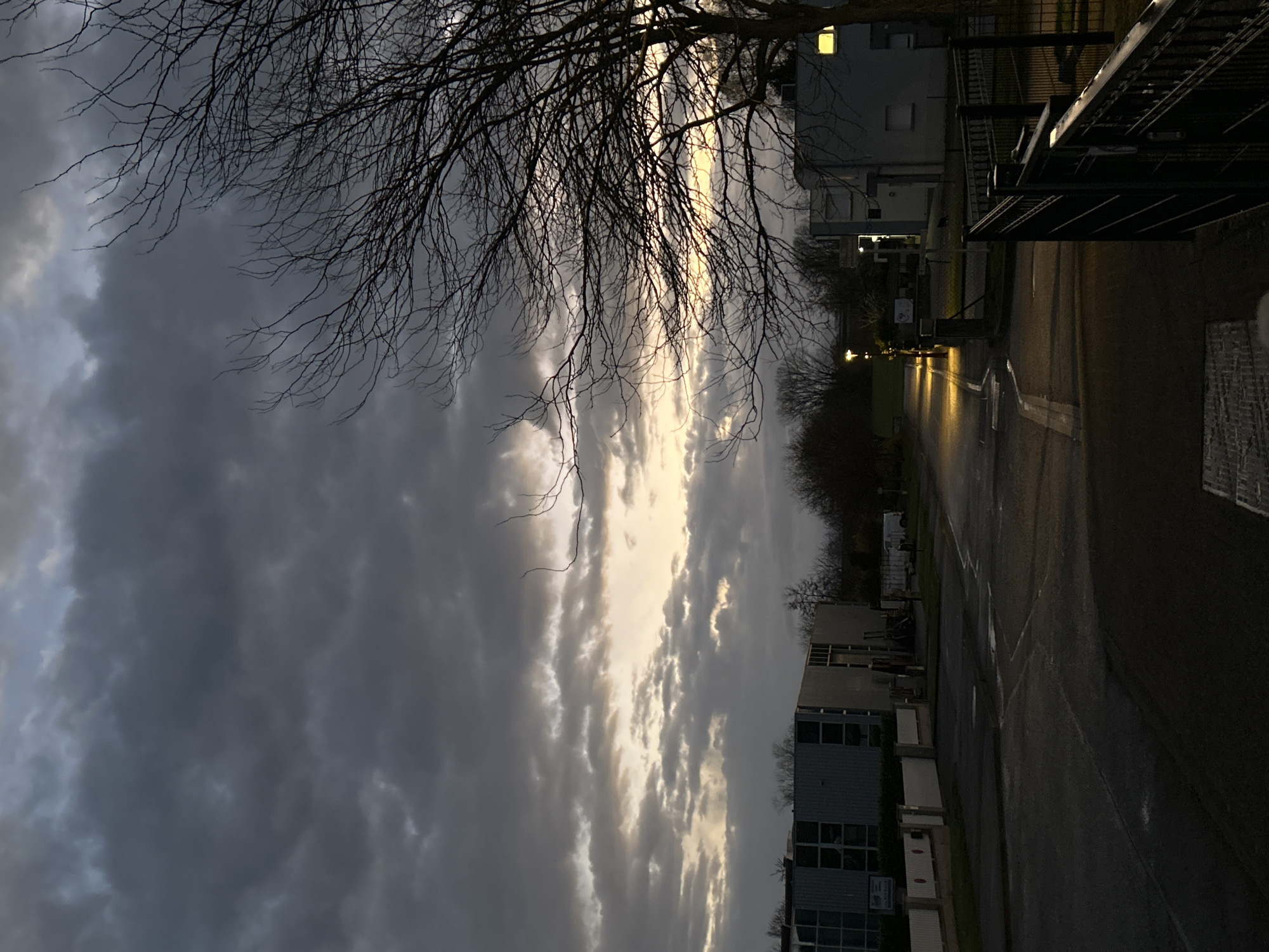 The image depicts a street in Truchtersheim, France, under a cloudy sky. The foreground includes bare tree branches silhouetted against the sky. A road runs through the middle, illuminated by streetlights. Buildings are visible on either side of the road. There are no people visible. A dark metal fence or gate structure is visible on the right edge of the image.
