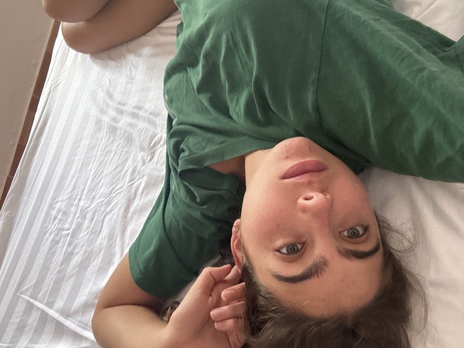 A young woman with fair skin lies on a white, striped bedsheet. She wears a dark green t-shirt. Her head is tilted, and she looks directly at the camera with light eyes and dark eyebrows. Her hand is near her ear, which has a small earring. Her lips are full and slightly parted. The background is slightly blurred, focusing attention on her face. The lighting appears natural, with soft shadows.