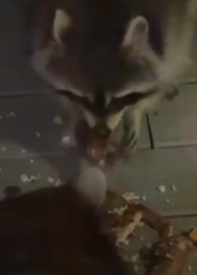 - "A raccoon is eating food off a gray slatted deck, as a person moves their hand in front of the raccoon" by FM-ownra2, licensed under CC BY 4.0