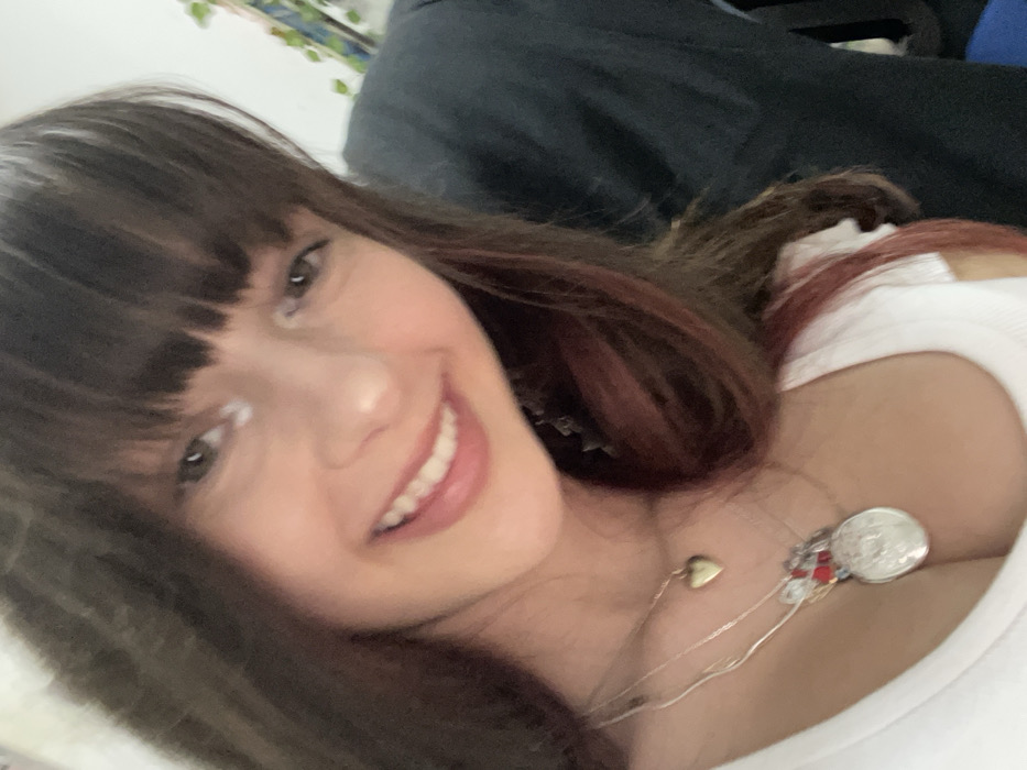 A female subject is depicted from the chest up in a close-up indoor shot. She has long, dark brown hair with bangs covering her forehead and reddish highlights visible on the right side. Her expression is a smile, revealing her upper teeth. She wears a white ribbed top and multiple necklaces: a shorter silver-colored chain with a small gold-colored heart pendant, and a longer silver-colored chain featuring a large circular silver-colored locket adorned with small colorful beads, including red and clear elements. The background is out of focus, showing a light-colored wall to the upper right with a trailing green plant (possibly ivy). A dark, indistinct object, likely furniture, is present on the right side of the frame behind the subject. The specific location within Raanana, Israel, cannot be determined from the visual evidence provided in the image.