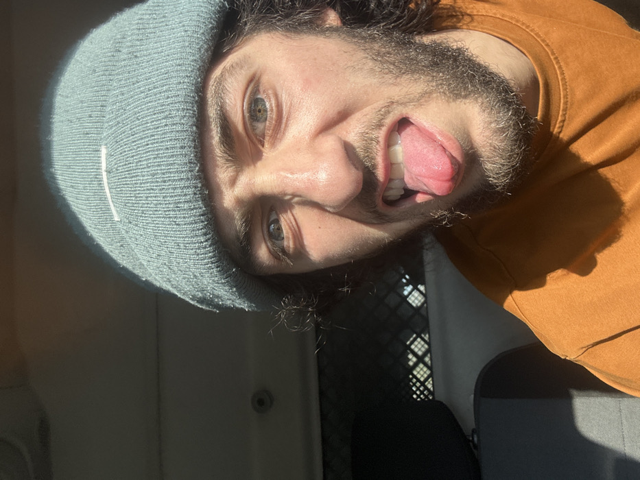 A close-up photograph depicts a male individual inside what appears to be a vehicle in Roncq, France. The subject, a young adult with dark, curly hair visible beneath a light blue knit beanie, is wearing an orange crew-neck t-shirt. He has a short beard and mustache. His eyes, appearing brown or hazel, are wide open, and his eyebrows are furrowed. His mouth is open, and his tongue is extended forward, revealing a pink surface and a reddish tip, along with visible upper and lower teeth. Strong sunlight illuminates the subject from the front-right, casting shadows on his face and shirt. In the background, a light grey ceiling and a dark grey headrest are visible on the left. A metal grid partition is present behind the subject, through which an outdoor scene with a light blue sky and ambient light is discernible.