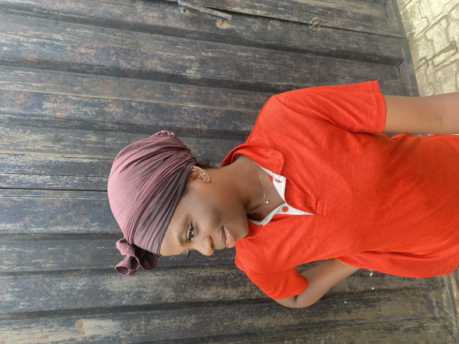 A young adult female, appearing to be of African descent, is depicted in a medium shot, smiling subtly and gazing towards her left against a textured, dark grey corrugated metal background, likely a gate or fence, in an outdoor setting in Lagos, Nigeria. She wears a dark reddish-brown headwrap, featuring a prominent decorative knot or rosette on the upper left side. Her attire includes a short-sleeved, bright reddish-orange polo shirt with a light grey collar and a placket secured by two visible white buttons. A thin, gold-colored chain necklace with a small, round white pendant rests on her collarbone. A silver stud earring is visible in her right earlobe. Her right arm is bent, with her hand resting on her hip, partially visible in the lower left of the frame. The ground directly beneath her consists of grey interlocking pavers.