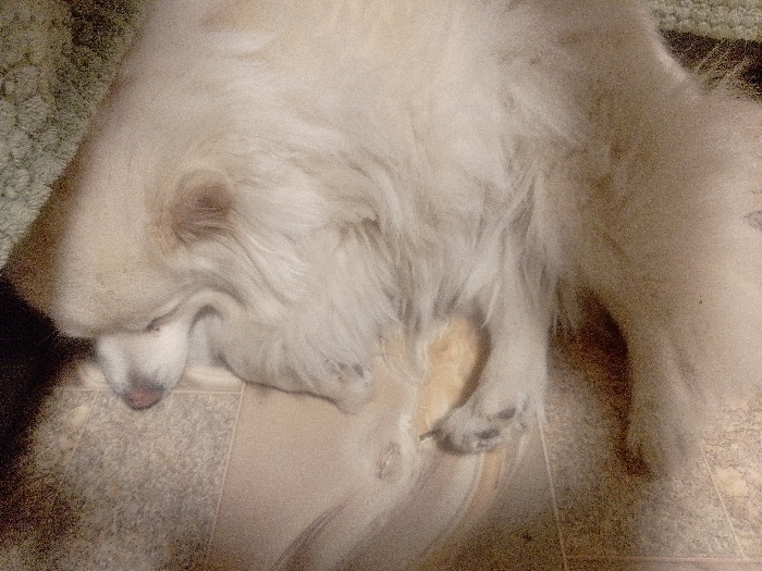 - "A light-colored, long-haired dog, likely a Samoyed or similar breed, is depicted lying on its left side on an indoor floor in Targovishte, Bulgaria" by FM-C4jWV2, licensed under CC BY 4.0