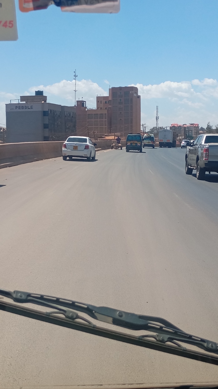 Vehicles of various types travel on a wide, paved road under a bright sky. A white sedan, a van, a small cart pulled by a person, a delivery truck, and a pickup truck are visible. Buildings, including one labeled "PEBBLE," rise in the background, along with a communication tower. The scene is captured from the perspective of a vehicle, as indicated by the windshield wiper in the foreground.
