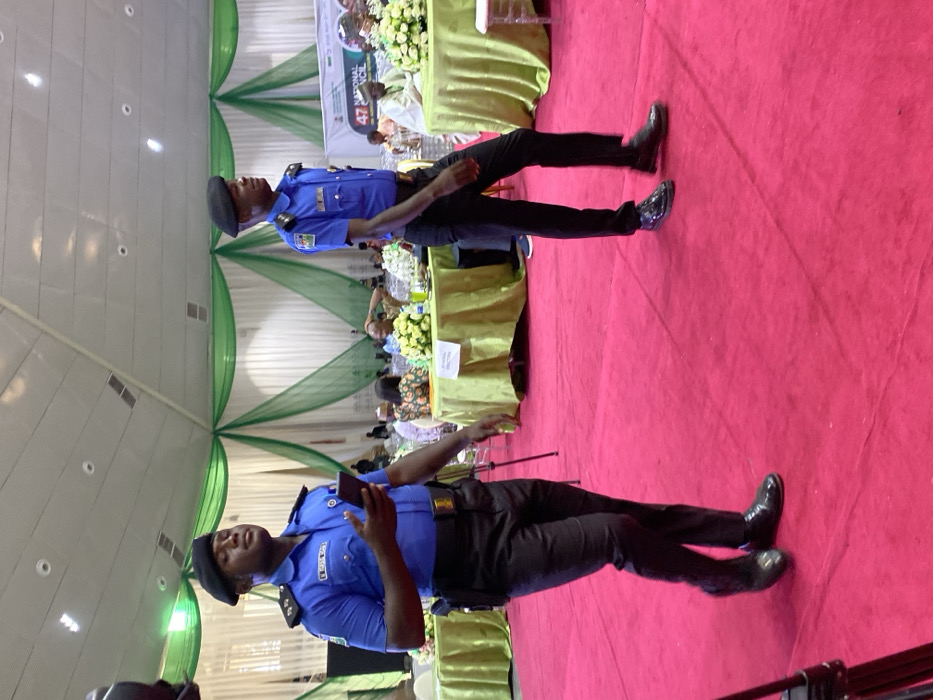 The scene is set indoors within a large, brightly lit hall in Unguwar Sarki, Nigeria, featuring a deep red carpeted floor and walls draped with green fabric. Two male individuals, identified as security or law enforcement personnel by their uniforms, are prominently featured. The individual on the left, of dark complexion, wears a short-sleeved blue uniform shirt with epaulets and badges, dark trousers, a dark beret, and a dark belt with a gold-colored buckle, from which an item resembling a holster or pouch hangs on his left hip. He is holding a dark-colored smartphone with both hands, looking down at the screen, and appears to be in mid-stride. The individual on the right, also of dark complexion and similarly uniformed in a short-sleeved blue shirt, dark trousers, and a dark beret, is depicted walking towards the right side of the frame, with his head slightly turned to the left and hands by his sides. Both individuals wear dark, polished dress shoes. In the mid-ground and background, multiple round tables are present, each covered with a light green tablecloth and adorned with a central arrangement of white and yellow flowers. Clear plastic chairs are arranged around the tables, occupied by various attendees. A large banner or sign, partially visible on the right, displays "47 NATIONAL COUNCIL," indicating a formal event or conference. The overall illumination is bright and even.