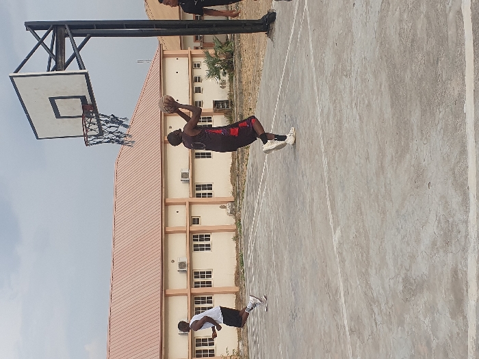 On a concrete basketball court, a basketball player in a red and black uniform leaps to make a shot. The basketball hoop is to his left. In the background is a two-story building with a red roof and white exterior. Two other individuals are partially visible: one behind the shooter, and another near the bottom of the image. The sky is overcast.