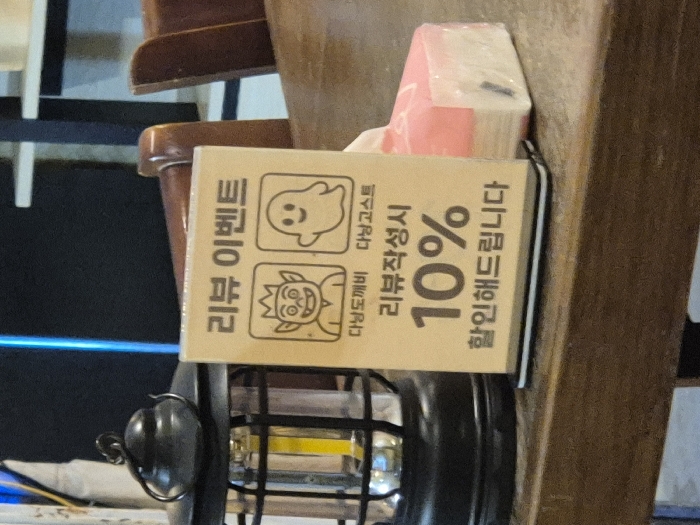 The scene depicts an indoor tabletop environment in Ngũ Hành Sơn Ward, Vietnam. In the foreground, positioned on a dark brown wooden table, is a cream-colored upright display sign in a black base. The sign features Korean text at the top reading "리뷰 이벤트" (Review Event) and two distinct cartoon illustrations: a smiling goblin-like creature with a crown on the left, and a smiling ghost on the right. Below these images, additional Korean text reads "다낭도깨비" (Danang Goblin) and "다낭고스트" (Danang Ghost). The lower part of the sign states "리뷰작성시 10% 할인해드립니다" (Upon writing a review, we offer a 10% discount). To the left of the sign is a black, metal-framed lantern with a prominent internal yellow light element. To the right of the sign, a pink rectangular tissue box, wrapped in clear plastic, rests on the table. The background is blurred, showing dark, undefined shapes and a vertical blue light line on the left. No individuals are present.