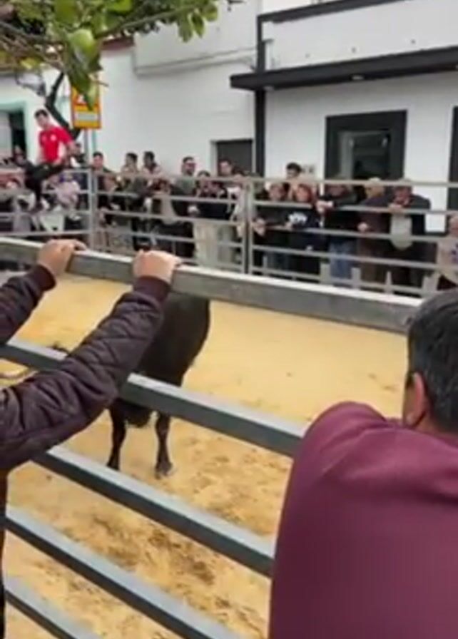 bull inside a fenced arena with people watching from behind the fence. The bull is black and is facing the fence. People are holding onto the fence and looking at the bull. There are people standing on the fence and in the background. The arena is filled with sand. The setting appears to be a town square with buildings in the background. The video is shaky, as if it was filmed with a hand-held camera.