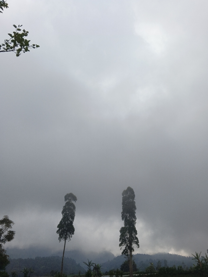 The scene depicts an outdoor landscape in Pinnwe, Myanmar (Burma), under a heavily overcast and uniform grey sky that occupies the upper two-thirds of the frame. In the lower portion, two tall, slender trees with dark green foliage stand prominently against a hazy, mist-laden background. A leafy branch from an unseen tree extends into the upper left corner. Below the prominent trees, the terrain appears cultivated, featuring various smaller plants and possibly agricultural crops, including leaves resembling those of banana plants. Distant hills or mountains are partially obscured by atmospheric mist and low-lying clouds, rendering their contours indistinct. No people, animals, or specific actions are discernible within the frame. The overall environment conveys a subdued, diffused light characteristic of a heavily cloudy or foggy day.