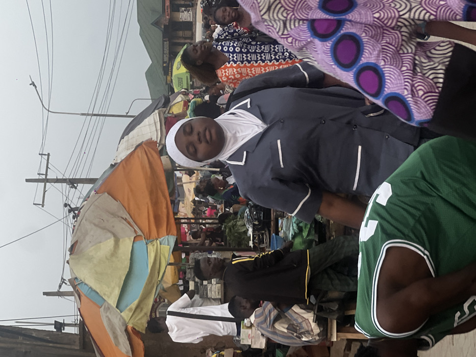A crowded outdoor market scene unfolds. A woman wearing a white headscarf and a blue shirt with white trim stands out. Other people are densely packed, and a man in a green Boston Celtics jersey is partially visible. Stalls covered with makeshift awnings of colorful tarps line the marketplace. Overhead, utility poles and wires crisscross, and buildings rise in the background.