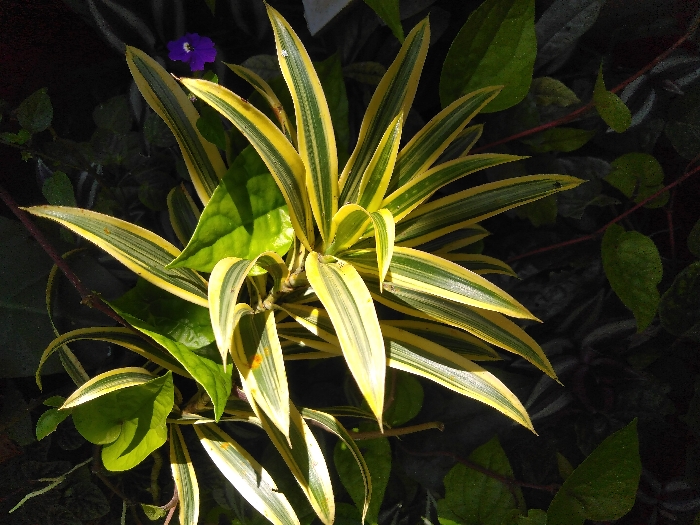 A close-up image captures a variegated plant, likely a *Dracaena reflexa 'Song of India'*, featuring prominent lanceolate leaves with longitudinal yellow and green stripes. The plant is illuminated from the upper left, highlighting the central cluster of leaves while casting the lower and background foliage into shadow. Additional green leaves from other plants are visible, some in focus, others blurred in the background, with one small purple flower discernible in the upper right quadrant. No people, objects other than plants, or specific actions are visible in the scene. The environment appears to be an outdoor garden or a well-lit indoor plant display in the city of Oslo, Norway.