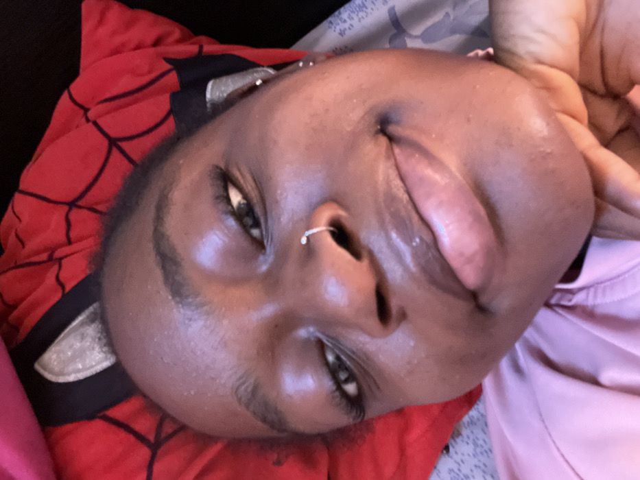 The image presents a close-up, high-angle selfie of a single individual, identified as a young Black female, captured from the chest up