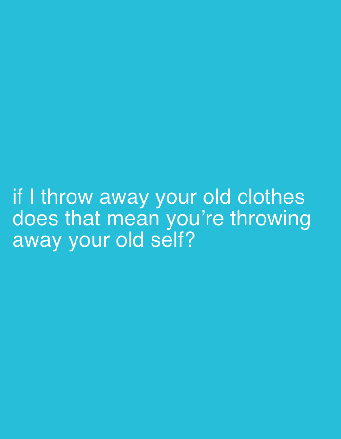 The image features white text on a bright teal background. The text reads, "if I throw away your old clothes does that mean you're throwing away your old self?"