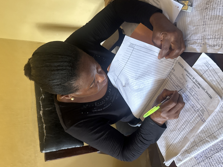 A middle-aged female individual is depicted from an elevated perspective, seated and actively writing in a lined ledger or notebook. She wears a long-sleeved black top with embellishments on the neckline and small, round, light-colored stud earrings. Her dark hair is styled, pulled back, and secured at the top of her head. With a bright green-capped pen held in her right hand, she inscribes text into the open ledger. Her left hand rests on the page, steadying the document. Visible text on the ledger includes "FEDERAL UNIVERSITY OF TECHNOLOGY, OWERRI" and "SEMESTER EXAMINATIONS," along with a numeric string "05130779." Several other similar ledgers and loose papers with handwritten entries are stacked on the dark, flat surface before her. A white stapler is partially visible among the papers on the right side of the frame. Behind the individual, a portion of a dark office chair with visibly cracked, synthetic leather upholstery is present. The room's wall is a uniform light yellow or cream color. The scene is situated within an office or administrative setting in Ihiagwa, Nigeria, specifically referencing the Federal University of Technology, Owerri.