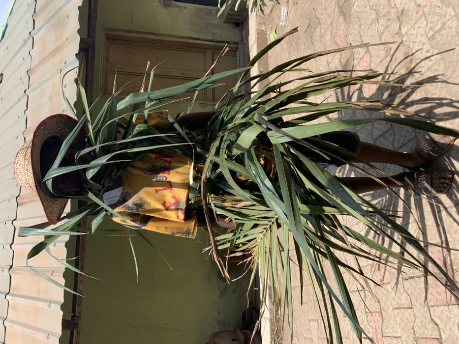 A person stands outdoors, centered in the frame, partially obscured by a large bundle of green foliage held in front of their body. The individual wears a straw hat with a red brim, a yellow short-sleeved shirt with black markings, dark shorts, and dark open-toed sandals bearing the "ZARA" logo. Their face is mostly hidden by the foliage, but dark eyes are visible through a gap in the leaves. The foliage consists of numerous long, narrow, green leaves, possibly resembling palm fronds or sugarcane stalks, which extend horizontally and downwards. The background features a light green or pale yellow stucco-like wall with visible cracks and discoloration, behind which is a brown wooden door with a dark handle on the right. Above the wall, a corrugated metal roof is visible. The ground is paved with rectangular reddish-brown and lighter-colored tiles. Bright daylight casts shadows from the person and foliage onto the ground. A clear plastic bottle lies on the ground to the right of the person, and some indistinct objects, including what appears to be a light-colored bowl or pot, are near the wall on the left. The scene is located in a residential or semi-urban area in Unknown, Unknown.