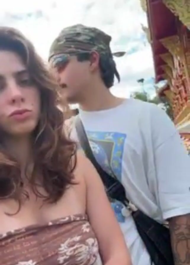 A young woman films herself with another person standing behind her and to her right. The woman is pale, with brown, wavy hair and wears a brown, strapless top printed with patterns and writing. She has a sullen expression. The person behind her is a young man with a mustache, wearing sunglasses and a camouflage bandana. He wears a white t-shirt with a graphic and a black cross-body bag. He is looking slightly away. They are outside, near a highly decorated Thai temple structure with gold trim. There is grass nearby. A dog is resting on the grass. The man shifts slightly and looks ahead. They are close to each other and walking slowly. The camera remains centered on the woman’s face, occasionally tilting slightly.