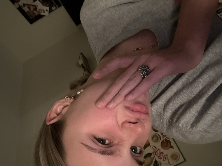 A person with light skin, green eyes, and blonde hair looks directly at the camera. Their face is partially obscured by their hand, adorned with a prominent ring. They wear a gray shirt. Visible jewelry includes earrings and a necklace. The background reveals a wall with pictures and a decorative item. A playful expression is apparent on their face, marked by a slight pout.