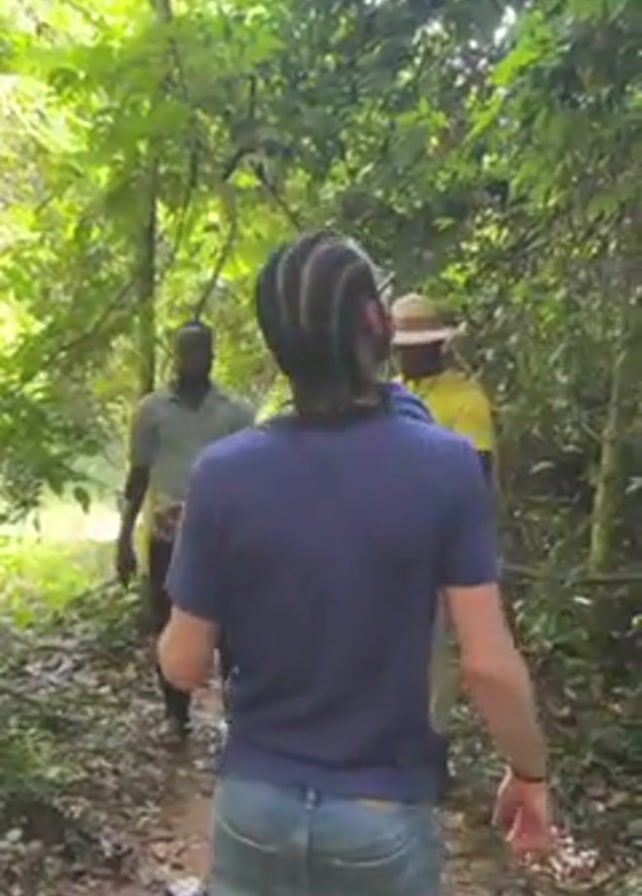 A group of people stand in a forest. One man wears a blue shirt and jeans with braided hair, holding a banana. He turns toward the trees. The camera shifts upward, focusing on a tall tree with dense foliage. A monkey is seen high up in the tree.