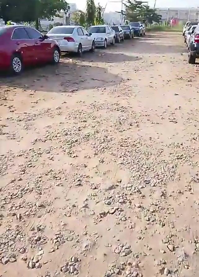 line of cars parked along a dirt road, filled with rocks and potholes, under a clear sky. The camera is stationary and captures a straight-on view of the road. Trees are visible in the background, along with a tall, light-colored building with multiple windows. There are no people visible in the scene.