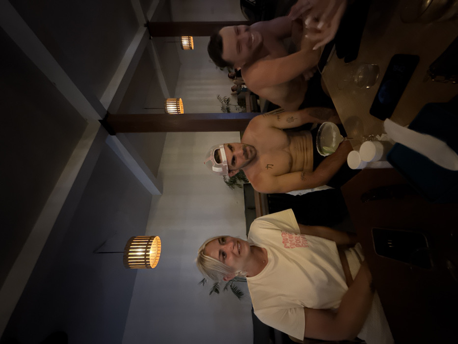 The image depicts an indoor scene in Uluwatu, Indonesia, likely within a restaurant or bar during the evening. Three individuals are seated at a dark wooden table in the foreground, illuminated by warm pendant lighting. On the left, a blonde female with short hair and earrings wears a cream-colored t-shirt with pink text reading "MORE AMOR POR FAVOR." She is smiling and looking towards her right, indicating engagement in conversation. To her right, a shirtless Caucasian male wears a light-colored mesh baseball cap backward. He has dark facial hair, a prominent Chinese character tattoo (力) on his left pectoral muscle, and other faint tattoos on his left arm. He is seated upright, looking slightly towards his left. A stemmed glass containing a light-colored beverage with a lime wedge rests on the table in front of him. On the far right, a second shirtless Caucasian male is visible, laughing or smiling broadly, facing towards the right side of the frame. A blurred hand, likely female, extends from the extreme right foreground onto the table, possibly interacting with this individual. Objects on the table include two smartphones, two small white cylindrical containers, and a dark blue napkin with a white napkin placed on top. The background reveals additional dark seating areas, potted plants, white walls, and dark wooden structural beams and pillars supporting the ceiling. Multiple cylindrical pendant lights with slatted wooden shades hang from the ceiling, providing ambient illumination. Several indistinct figures are seated at tables in the deeper background.