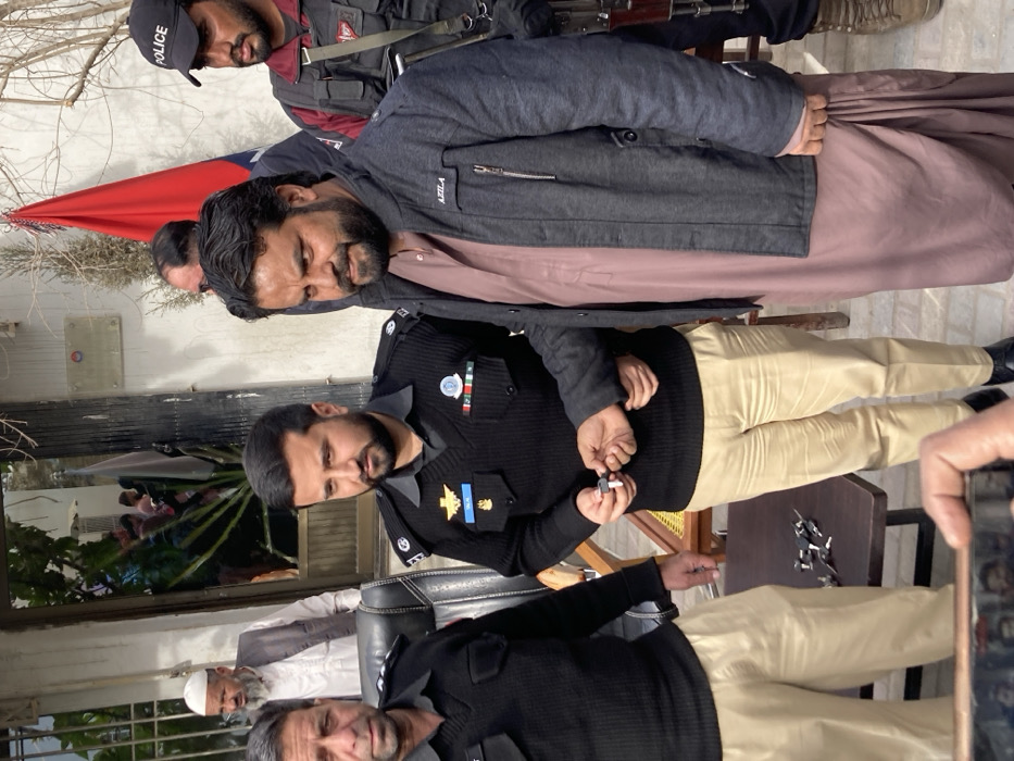 The scene depicts an outdoor gathering of several men in Quetta City Tehsil, Pakistan, likely in front of an official building