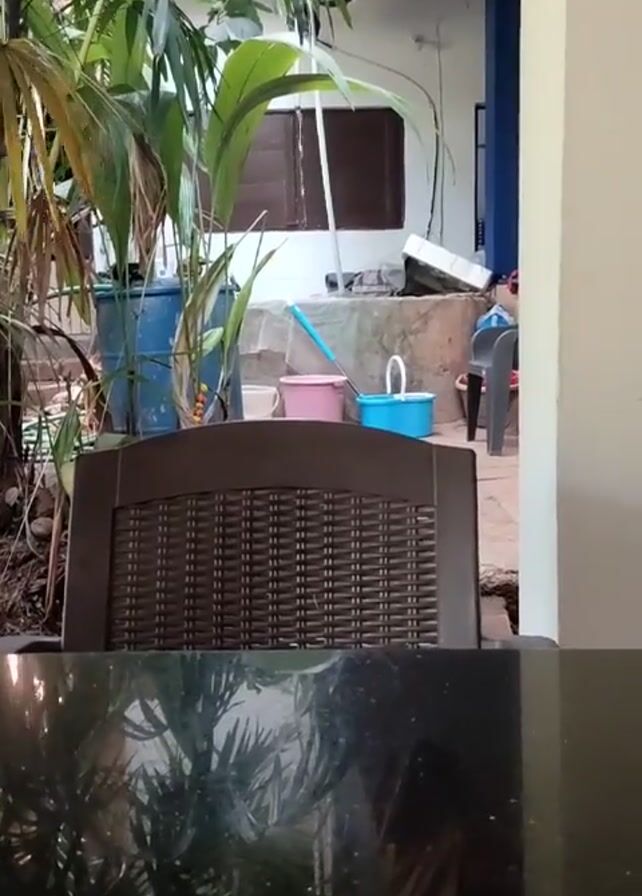 view from inside a building, looking out onto an outdoor area. The foreground features a dark, reflective tabletop and a brown plastic chair. In the background, there are several large potted plants and a white building with a blue column. There are also various objects scattered around, including blue and pink buckets, a blue barrel, and other miscellaneous items. The lighting suggests it is daytime, though somewhat overcast. There are no people clearly visible in the shot, and the overall impression is one of a casual, perhaps slightly cluttered, outdoor space.