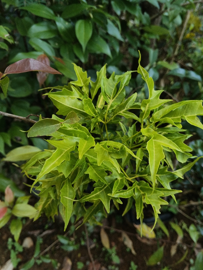 The image displays a close-up, slightly overhead perspective of a vibrant plant situated in the city of Unknown, Vietnam. The central subject is a compact cluster of bright lime green leaves, deeply lobed with irregular, jagged margins, presenting a somewhat star-like or palmately divided appearance. Visible veins trace through the slightly lighter green leaf surface. The plant is in sharp focus, dominating the frame. The background is blurred, featuring dense, darker green foliage above and to the sides, with a reddish-brown new leaf visible in the upper left. The lower background consists of out-of-focus dark brown soil or ground cover, interspersed with fallen leaves and sparse ground vegetation. The environment is consistent with an outdoor natural setting, such as a garden or nursery.