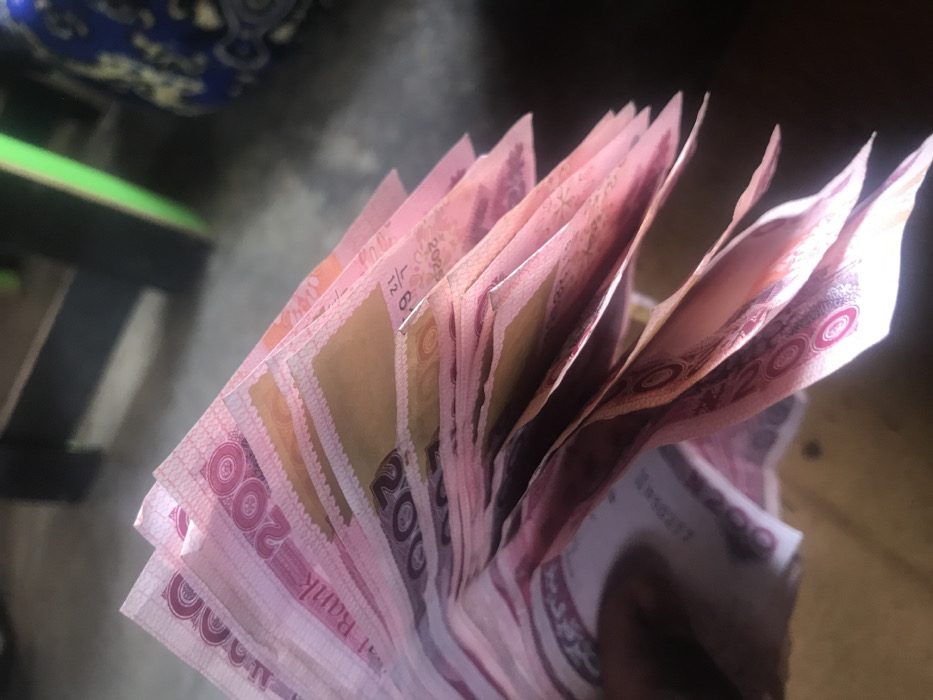 A close-up photograph captures a fanned stack of Nigerian 200 Naira banknotes, held by an individual's hand partially visible in the lower left