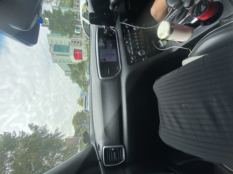 The scene is observed from the front passenger seat of a vehicle positioned on a multi-lane urban road in Sandton, South Africa. The vehicle's dark dashboard with chrome-trimmed air vents is prominent. A central infotainment screen displays navigation, and a smartphone is secured in a mount to its right. Controls for climate and media are visible below. The driver's right arm is partially visible on the far right, near the gear shift. In the center console, a light-colored thermal mug and a red Coca-Cola branded container are situated in cup holders, accompanied by white charging cables. The passenger's legs, covered by dark, vertically striped fabric, occupy the lower left foreground. Through the windshield, an overcast sky is visible above the road. Multiple vehicles are present in traffic ahead, indicating a typical urban flow. On the right, the multi-story AON Building, characterized by its modern design and green-tinted glass, features the 'AON' logo on its facade and a large red rectangular sign below. Trees line both sides of the street, and traffic lights are visible in the distance. The vehicle is located on Sandton Drive, facing eastward, with the AON Building at 1 Sandton Drive visible on the right.