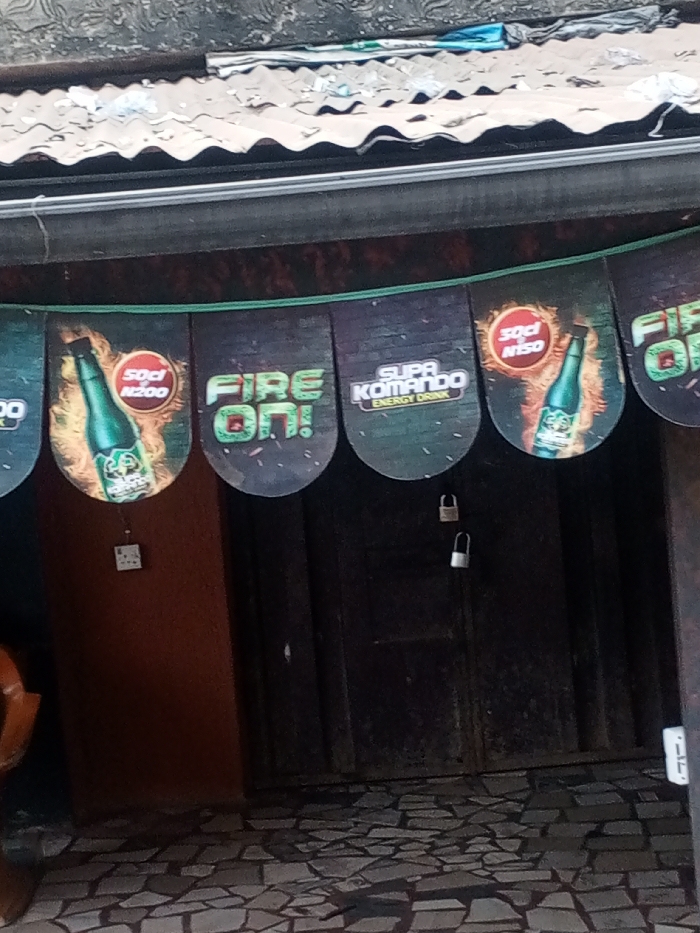 This image depicts the exterior of a structure, presumably a shop or business entrance, located in Obosi, Nigeria. An overhead corrugated metal awning extends across the top of the frame. Below the awning, a series of promotional banners are strung horizontally. These banners are semi-circular at their lower edges and display advertisements for "FIRE ON!" and "SUPA KOMANDO ENERGY DRINK." Specific banners feature a green bottle, likely of the advertised energy drink, with pricing indicated as "50cl N200" and "50cl N150." To the right, a dark, double-leaf wooden door, likely the main entrance, is visible. This door is secured by two silver-colored padlocks, one positioned above the other, attached to the right door leaf. To the left of the door, a reddish-brown wall features a white electrical outlet with multiple sockets mounted on its surface. The ground directly in front of the entrance is paved with irregularly shaped grey and off-white stones or tiles, forming a mosaic pattern. A curved brown object is partially visible on the far left, and a thin white vertical object is partially visible on the far right. No individuals are present in the scene.
