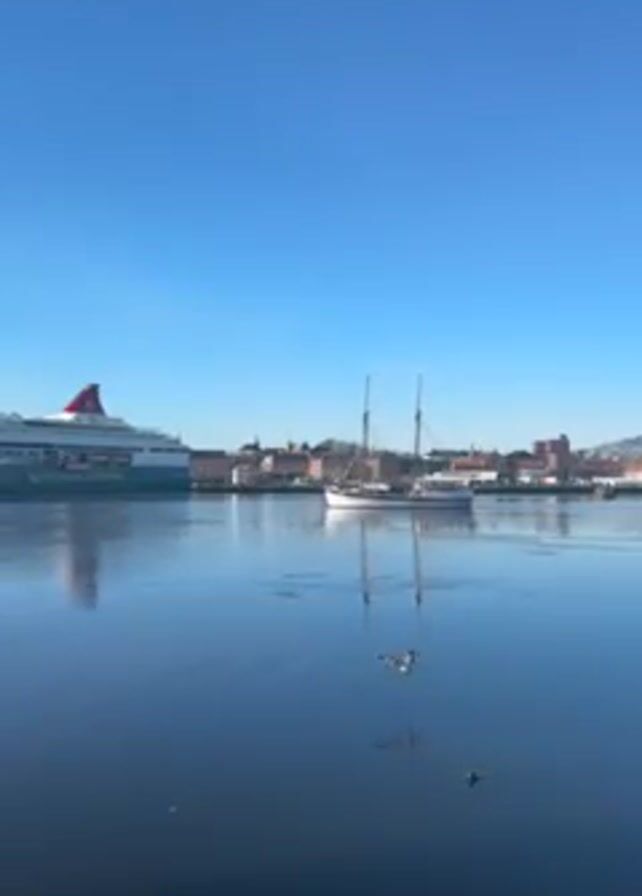 calm body of water under a clear blue sky. A large cruise ship is docked on the left side of the frame, with a white sailing vessel closer to the center. The city skyline is visible in the background. Two birds fly across the water's surface in the foreground. The water reflects the sky and the vessels, creating a mirror-like effect.