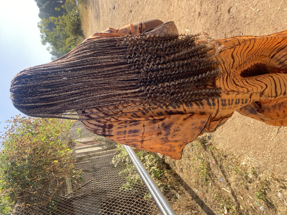 An individual, viewed from behind, is walking outdoors in an unpaved, sunlit area within the city of Jos, Nigeria. The person has long, light brown box braids with curly ends extending down to the waist. They are wearing a flowing, orange garment with dark brown or black tie-dye patterns, featuring abstract blotches on the upper portion and horizontal stripes on the lower. A light-colored handbag is slung over the right shoulder. To the left, a chain-link fence is visible, densely covered with green and brown foliage, alongside a silver-colored metal railing. The ground is dry, reddish-brown earth with sparse dry vegetation. In the background, a clear sky is visible above additional trees and shrubs.