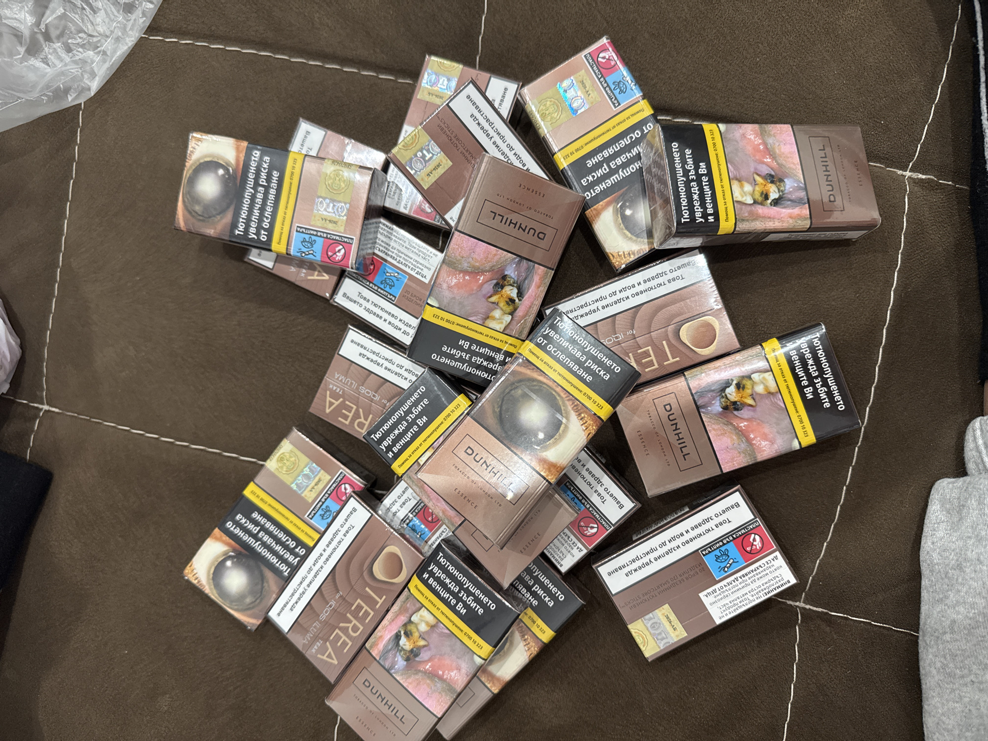pile of cigarette packs on a brown surface. The packs are a mix of "Dunhill" and "TEREA" brands, with Bulgarian text and graphic health warnings.