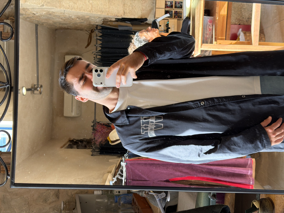 The image depicts a mirror selfie taken indoors. A Caucasian male, approximately 25-35 years old, with dark hair and stubble, smiles with eyes partially closed, holding a light-colored smartphone (featuring a triple camera array) in his right hand. He is wearing a white crew-neck t-shirt and a dark, collared jacket with 'FREE FOOTBALL' and a stylized 'W' logo (reversed) printed in white on the left chest area. The reflection reveals a rustic interior with light-colored stone or stucco walls. An air conditioning unit is visible on the upper wall. To the left, shelves hold various glass containers and bottles, alongside clothing racks displaying red and magenta garments. To the right, a wooden counter is visible, reflecting a partial view of an older female's head with grey curly hair, alongside a display of colorful small items in compartments. The mirror itself has a dark, ornate metal frame. The specific location within Hof HaCarmel Regional Council, Israel, cannot be determined from the image.