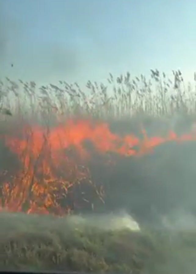 field fire from the perspective of inside a vehicle. Flames and smoke are visible rising from the grass and reeds. The sky is blue, but partially obscured by smoke. The dashboard of the vehicle is visible at the bottom of the frame. The fire is burning intensely, creating a significant amount of smoke.