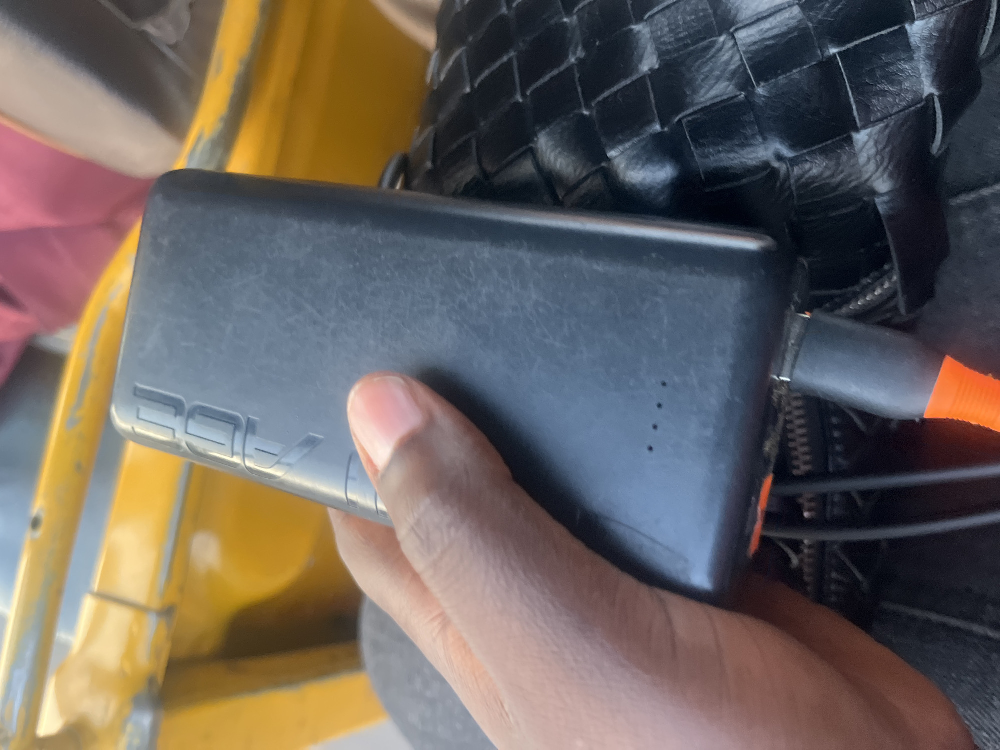 A hand is holding a black ADE power bank