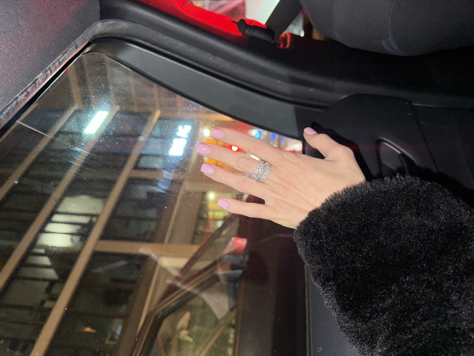 A person's hand rests on a car window, adorned with multiple silver rings. The nails are painted a light pink. Outside the window, a building with reflective surfaces is visible. The arm is covered by a black, fuzzy fabric. The car's interior features a black frame around the window and a black headrest. Red lights are faintly visible near the top of the frame.