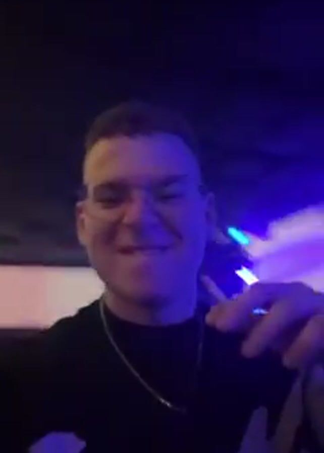 A young man with short hair, glasses, and a gold chain is recording a video of himself at a nightclub. He is wearing a dark sweatshirt with a white graphic on it. The club is crowded, with people dancing and socializing. The lighting is primarily blue. The man is smiling and gesturing with a cigarette in his hand.