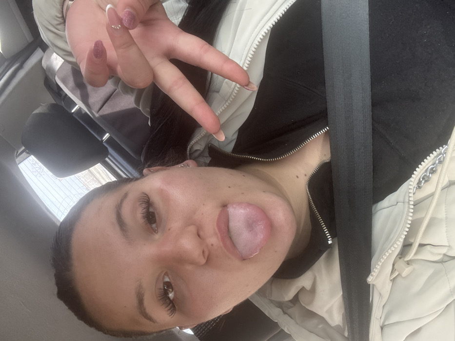 The image depicts a female individual positioned within the interior of a vehicle. The stated location is Burgas, Bulgaria. She has dark hair, pulled back from her face, and prominent eyelashes. A small piercing is visible on the upper helix of her right ear. Her mouth is open, with her tongue extended forward. Her left hand is raised in a 'V' gesture, with fingernails painted with pink glitter polish; the ring finger also exhibits a clear French tip with a small decorative element. She is wearing a light-colored, possibly beige, quilted jacket over a dark, zippered garment, secured by a black seatbelt across her chest. The background shows a blurred view through the vehicle's rear window, consistent with outdoor daylight conditions.