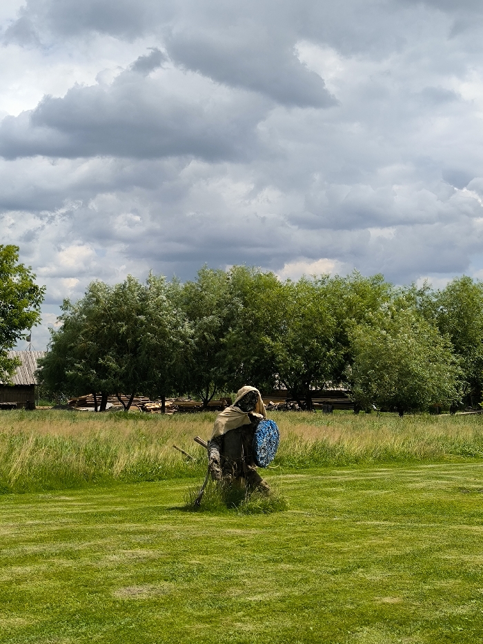 A scarecrow wearing a hooded cape and holding a blue shield stands in a field of green grass. Behind it, a line of trees separates the field from a background featuring an old wooden building and piles of lumber. An overcast sky filled with thick gray clouds dominates the upper portion of the image.
