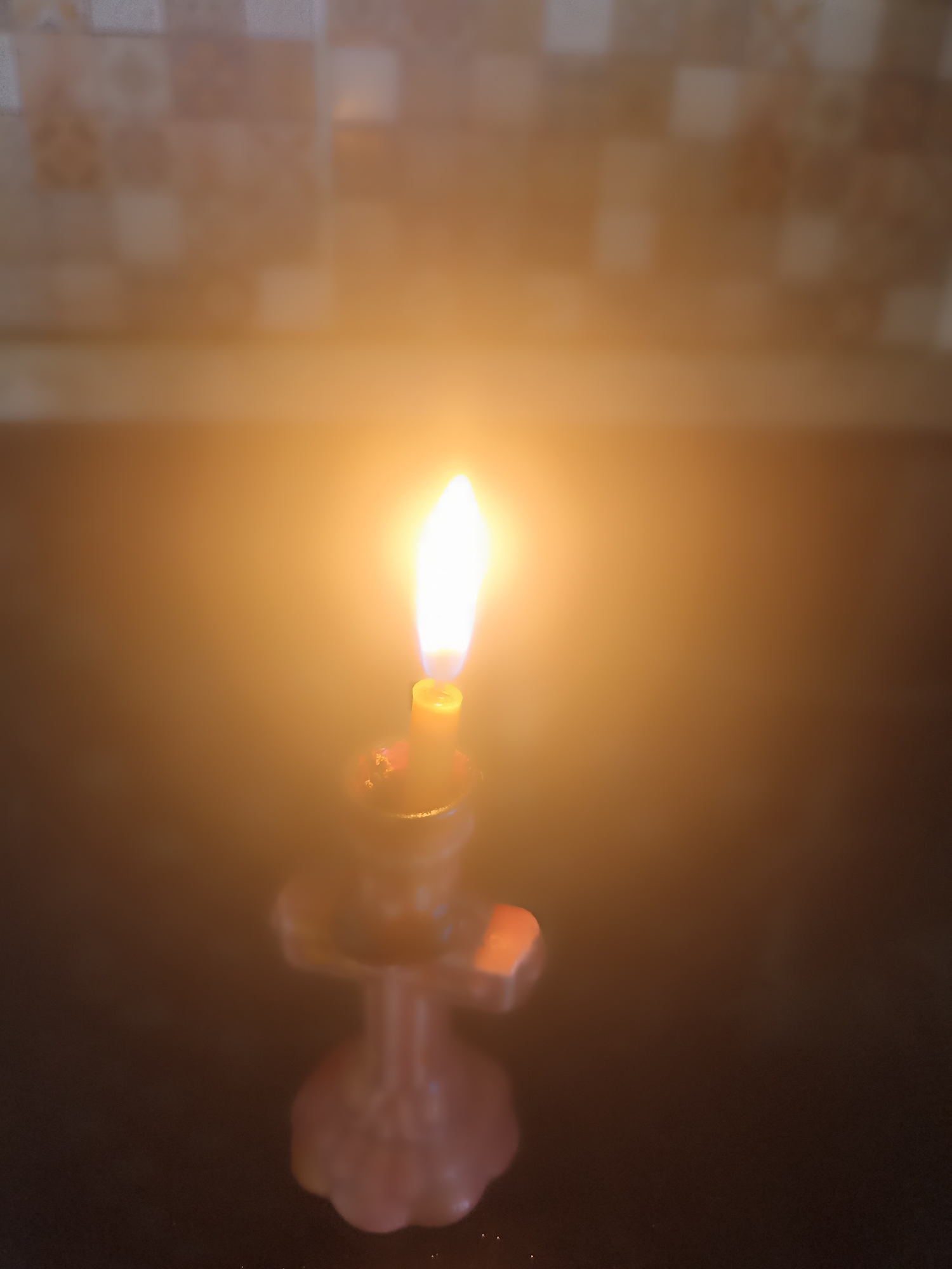 A single, lit yellow wax candle stands in a light-colored, possibly pinkish, decorative holder with a scalloped base. The candle is placed on a dark, indistinct surface. Its bright, vertical flame is the primary light source, casting an intense orange glow across the immediate surroundings. Melted wax has accumulated at the base of the candle within the holder. The background consists of a severely out-of-focus wall featuring a grid pattern of light-colored, likely beige or brown, square tiles. No individuals are present in the scene. This event is located in Serpukhov, Russia.