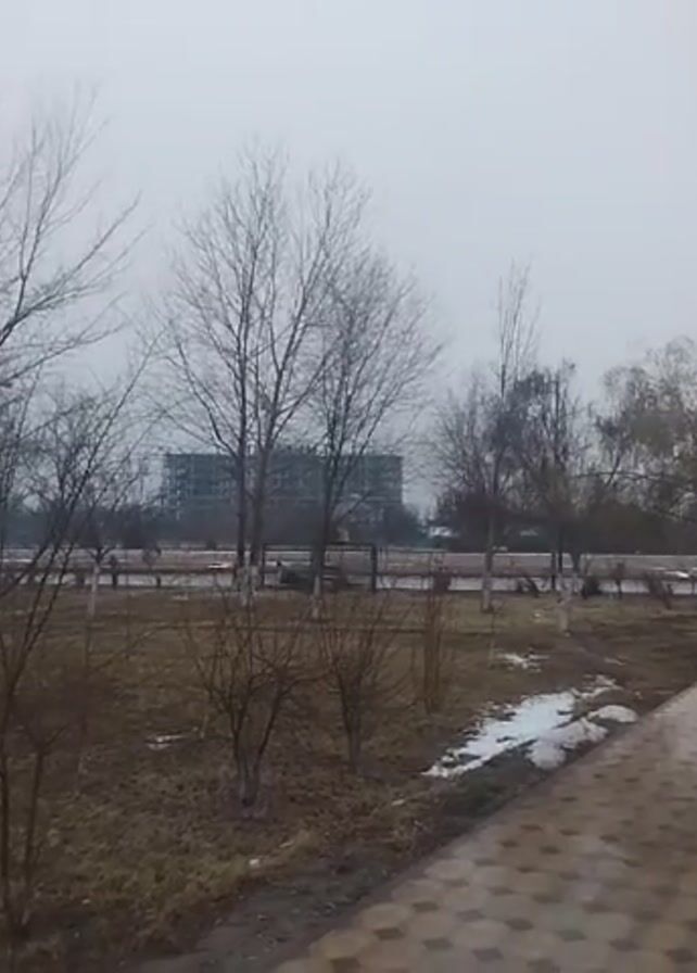 The camera shows a view of an urban park on a cold, overcast day