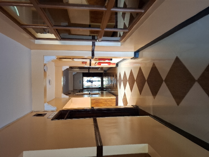 n interior hallway in a building located in Karagita, Kenya, at coordinates -0.754 latitude and 36.438 longitude. The hallway is narrow and has beige walls with brown trim. The floor is tiled with white and brown diamond-shaped tiles. There is a closed door at the end of the hallway, which is the only entrance to a room. The door is made of dark wood and has a white trim. The hallway is lit by artificial light. There is a large window on the right side of the hallway. The window is made of glass and has a dark wood frame. The window is open, and the outside is visible. There is a fire extinguisher on the right wall, near the window. There is a single person, partially obscured, walking down the hallway toward the closed door. No other people are visible in the hallway. The image appears to be taken in daylight.