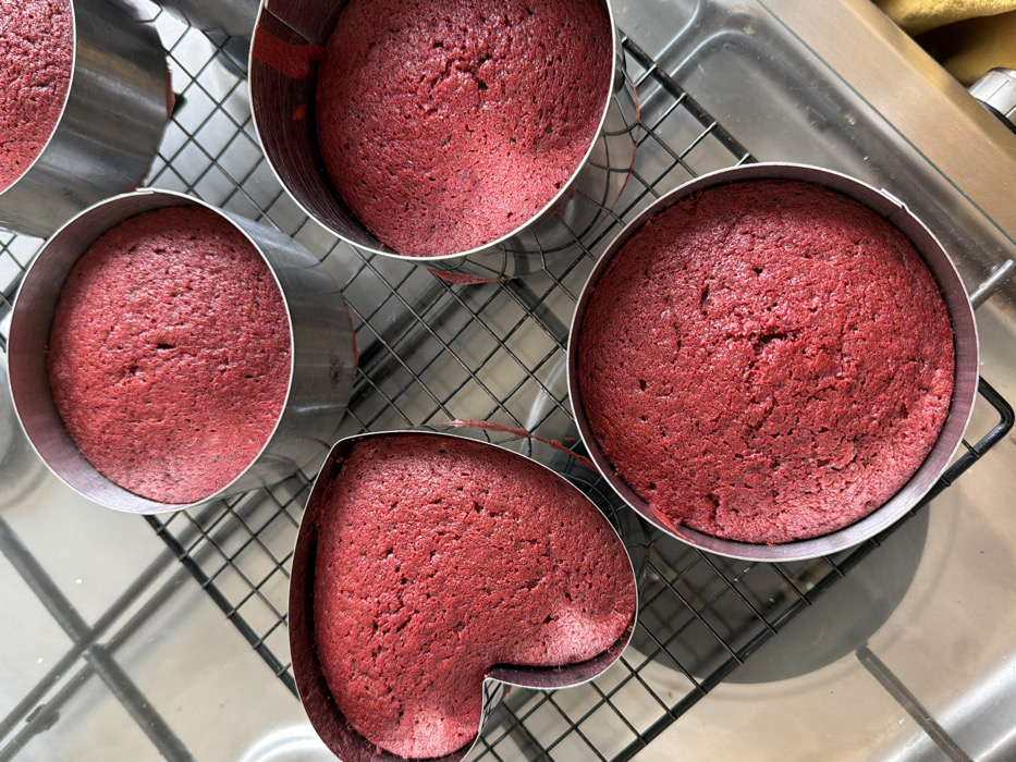 Five freshly baked red velvet cakes rest on a wire rack. Four are circular and baked in metal rings, while one is shaped like a heart. The cakes are positioned close together, their surfaces showing a fine, even texture. The rack sits on a stainless steel counter near a sink. The cakes fill the frame, emphasizing their rich color and appealing appearance.
