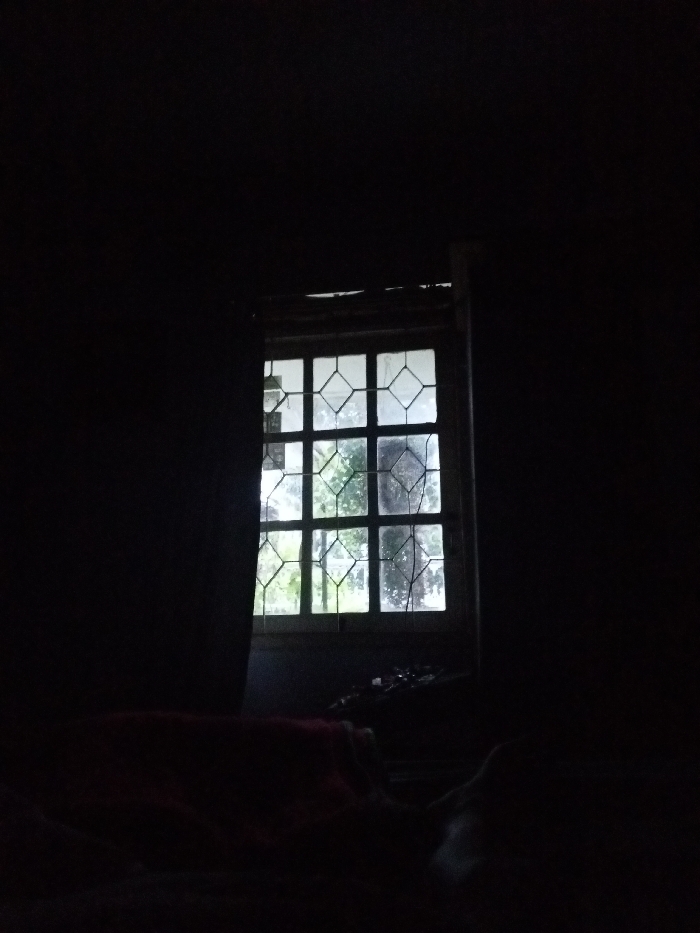 The image displays an interior room located in Qorday, Kazakhstan, characterized by extremely low light conditions. A rectangular window is centrally positioned, serving as the sole light source, illuminating the immediate area around its frame. The window features a multi-pane design with a grid pattern composed of both square and diamond shapes. Through the window, an outdoor environment is visible, dominated by green foliage suggesting trees or shrubs. Traces of dirt or residue are present on the exterior glass surfaces of the windowpanes. To the left of the window, a dark vertical structure, likely a wall or closed curtain, partially frames the view. In the lower midground, a dark reddish-brown textile object, possibly a blanket, is partially visible, resting on an obscured surface. A lighter, amorphous shape is indistinctly discernible to the right of the textile object. No individuals are present in the scene.