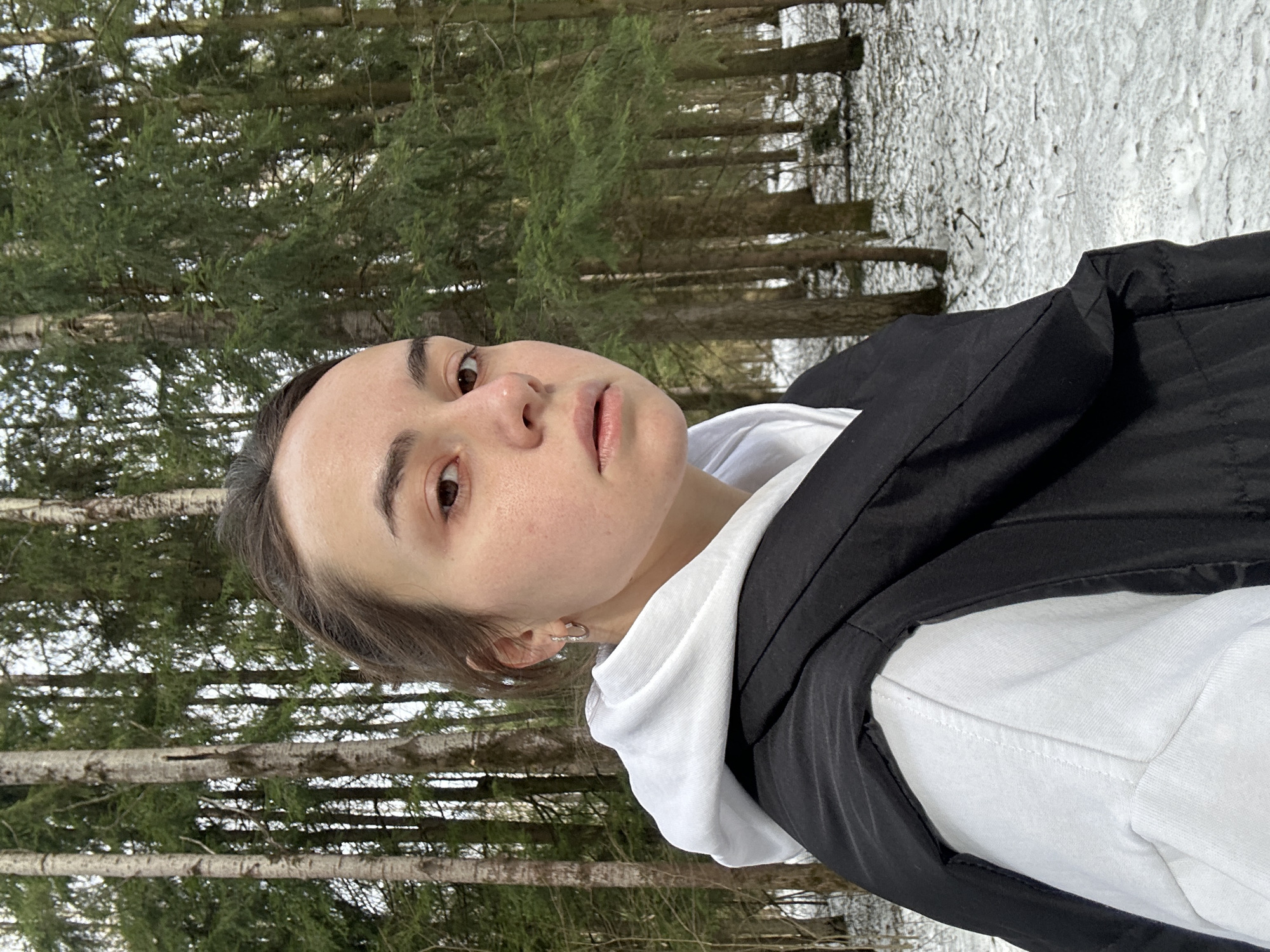 A single individual, identified as an adult female, is depicted in a medium-shot photograph taken in a wooded area within Trudovaya, Russia. The subject has dark hair pulled back, fair skin, and brown eyes, looking directly at the viewer with a neutral expression. She wears a white hooded sweatshirt under a black sleeveless puffer vest or jacket, and a small silver hoop earring is visible in her left ear. The background consists of numerous deciduous trees with light-colored trunks and evergreen coniferous trees. The ground is partially covered in patches of snow and visible organic material, consistent with a winter or early spring environment. No other individuals or significant man-made objects are present.