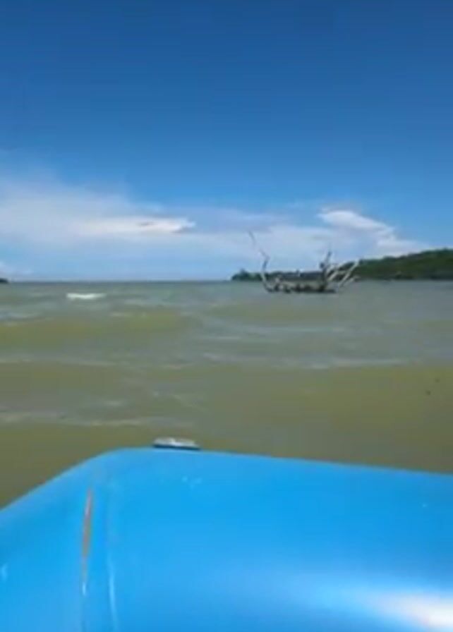 The view from a blue boat reveals a tranquil body of water under a clear blue sky dotted with wispy clouds. A clump of dead, bare branches protrudes from the water's surface, positioned off to the right side of the frame. In the background, a verdant coastline is visible, suggesting the presence of land nearby. The water has a slightly murky, greenish-brown hue. The boat appears to be moving, as the water's surface shows gentle ripples.
