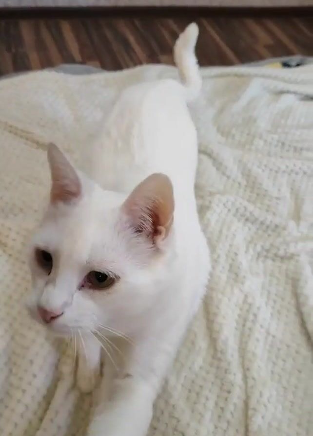 - "A video shows a white cat lying on a white textured blanket on a bed" by FM-pJyc73, licensed under CC BY 4.0