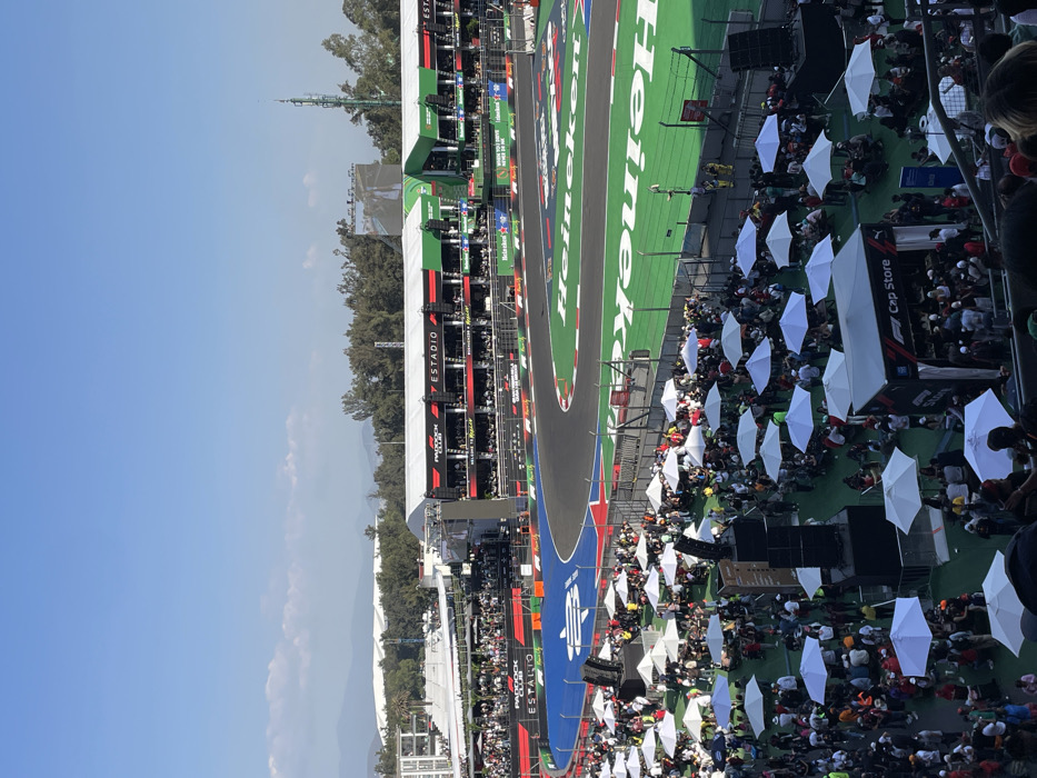 This image depicts a wide view of the Autódromo Hermanos Rodríguez circuit in Mexico City, Mexico, specifically within the "Estadio" section during a Formula 1 event