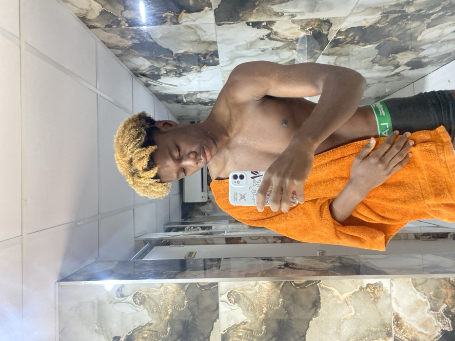 In an indoor reflective space within the city of Moba, Nigeria, a young adult male is captured taking a mirror selfie. The subject, with dark skin and bleached blonde curly hair, is bare-chested with visible water droplets on his skin. He wears dark boxer briefs featuring a green waistband and has an orange towel draped over his left shoulder and arm. His left hand holds a white smartphone, positioned to capture his reflection, with a decorative case adorned with skull-like motifs. His eyes are cast downwards towards the phone screen. A silver-colored ring is present on his right ring finger. The background consists of walls partially covered with dark, mottled grey and white marble-patterned tiles and sections of plain grey or silver reflective tiling. A white paneled ceiling is visible overhead. In the reflection, a white wall-mounted air conditioning unit is situated in the upper right, and a metallic door frame or shower enclosure with an unreadable rectangular plaque is visible on the left.